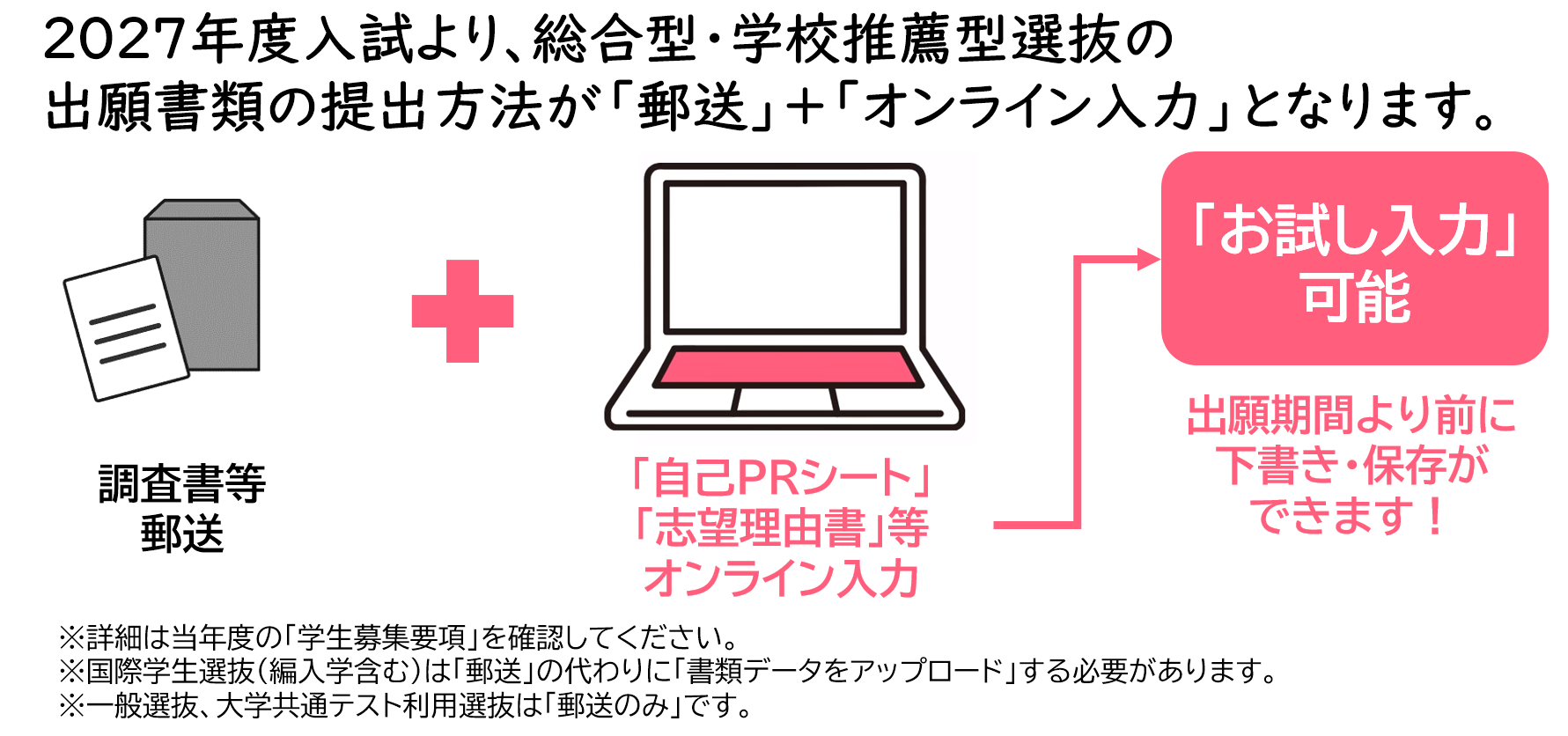 なお、以下方式のいずれかの出願資格を満たす方は、「特別枠・推薦枠」で出願し、自身の特徴ある経験をアピールすることができます。選抜内容は総合評価方式とほぼ同様ですが、若干異なる場合があり、出願書類も異なりますので、詳細は入試ガイドおよび募集要項を参照してください。