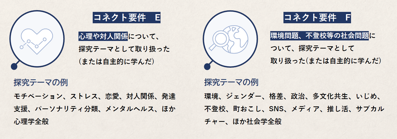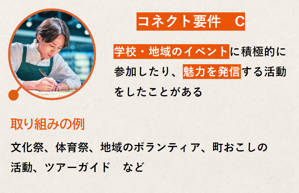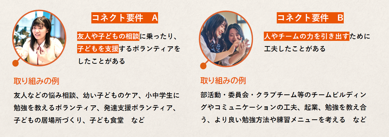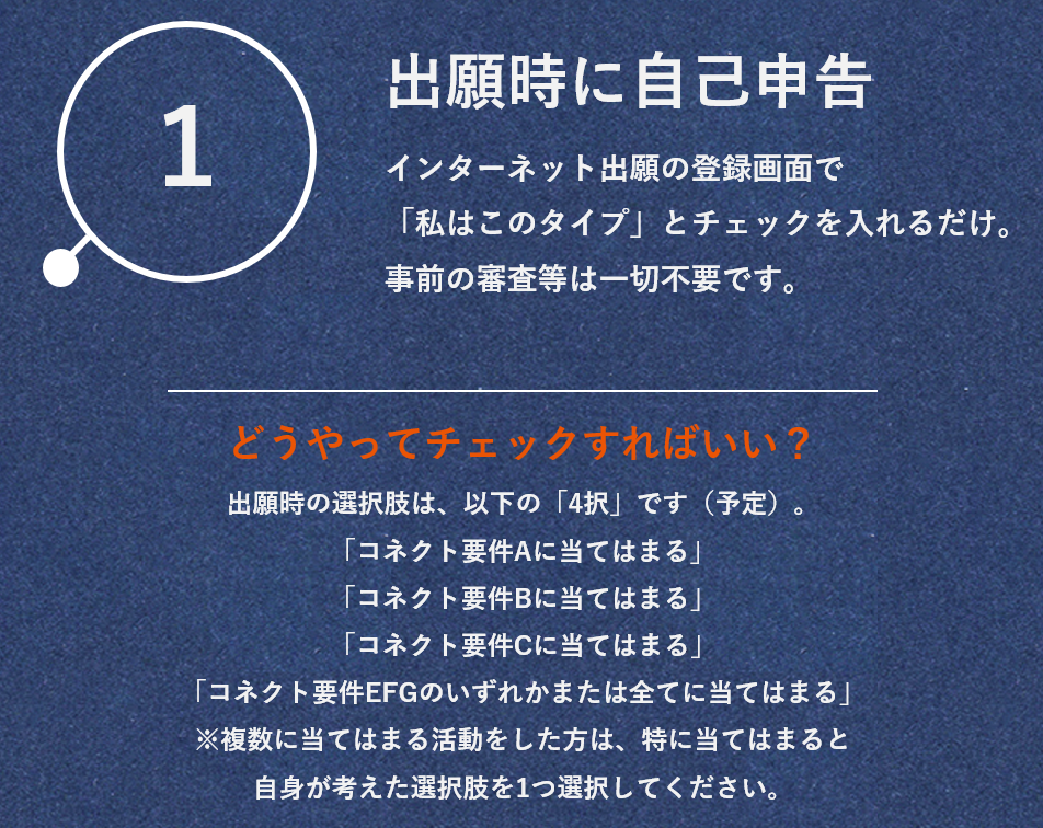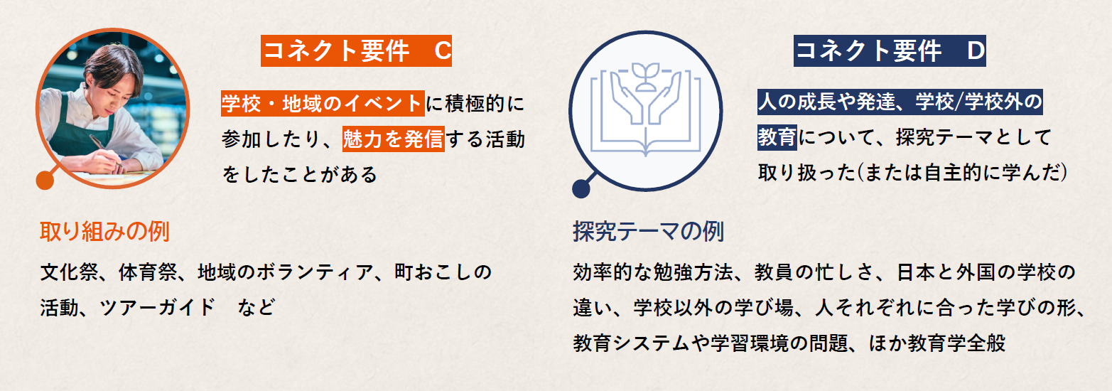 ※出願書類の中では、申告した要件に関連する活動について必ず触れてください(自己PRシート、活動報告書、探究活動報告書等)。自己PRシート等の自由入力欄で、「~~だから私はコネクト要件を満たします」のような記述をする必要はありません。あなたがコネクト要件を満たす活動をしていたことが書類審査の際に確認できれば、入試において加点されます。なお、加点になったかどうかの審査結果は通知されません。