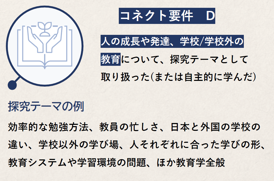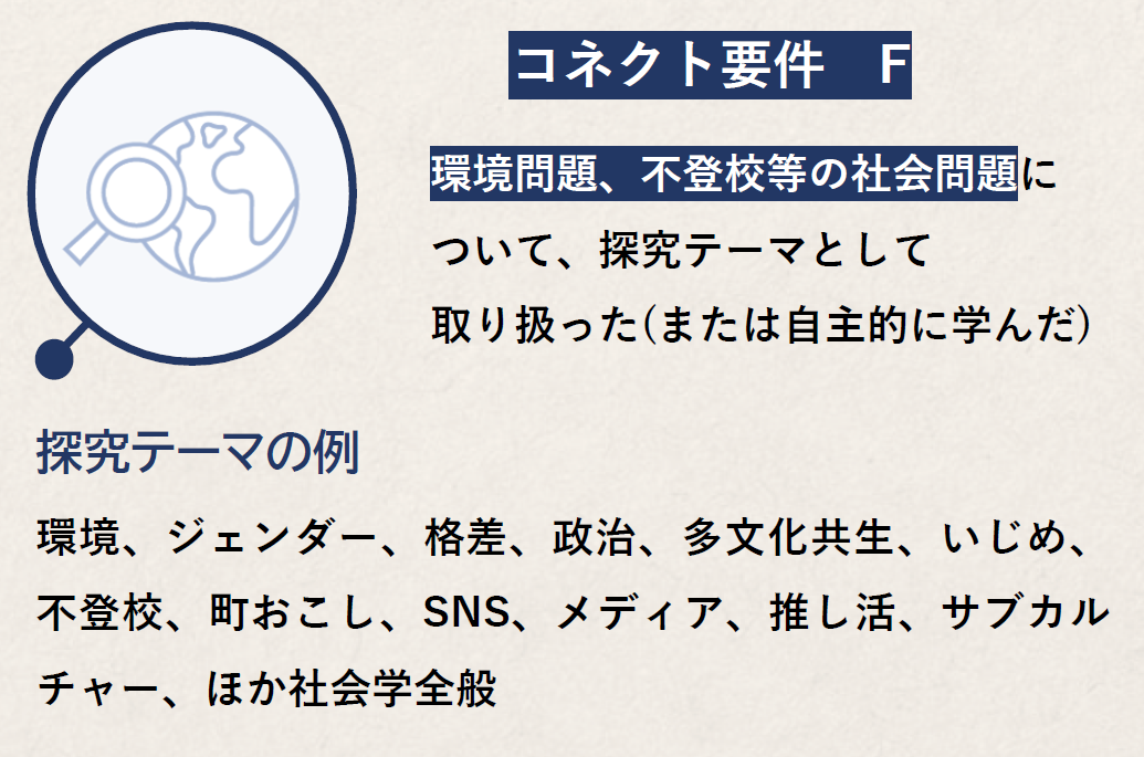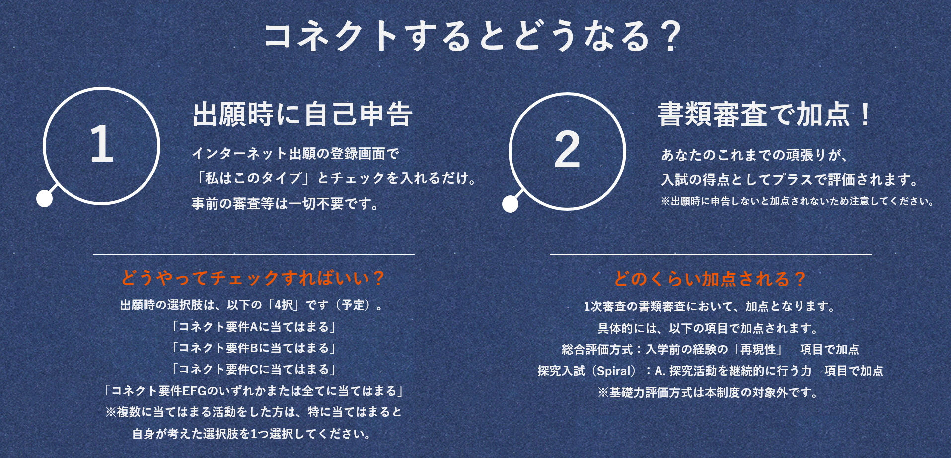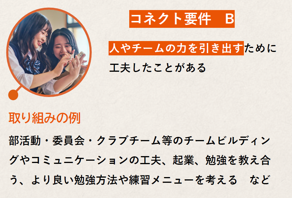 ※出願書類の中では、申告した要件に関連する活動について必ず触れてください(自己PRシート、活動報告書、探究活動報告書等)。自己PRシート等の自由入力欄で、「~~だから私はコネクト要件を満たします」のような記述をする必要はありません。あなたがコネクト要件を満たす活動をしていたことが書類審査の際に確認できれば、入試において加点されます。なお、加点になったかどうかの審査結果は通知されません。