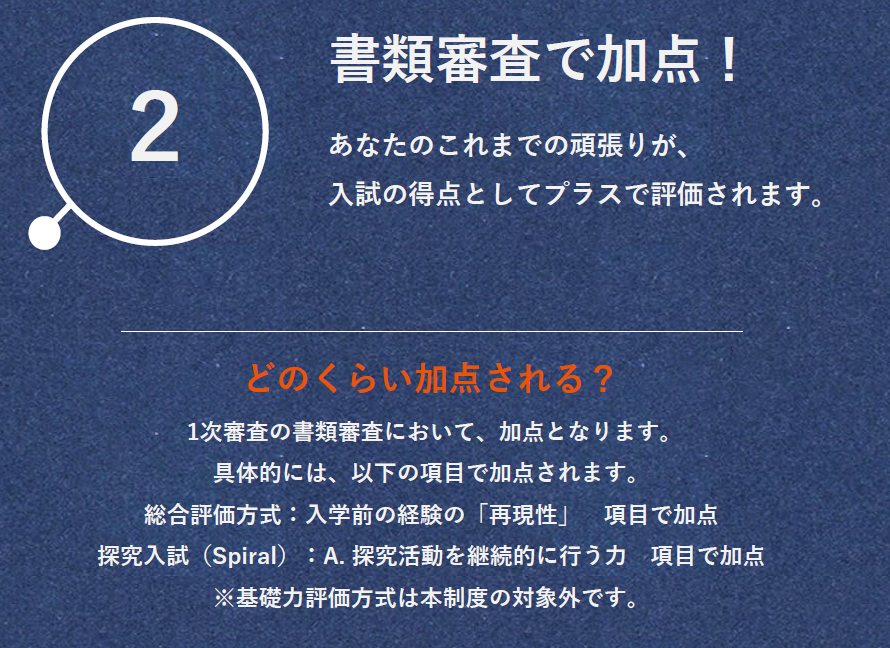 さらに、特定のプログラムの優秀者は、総合型選抜の1次審査免除を受けることもできます。
