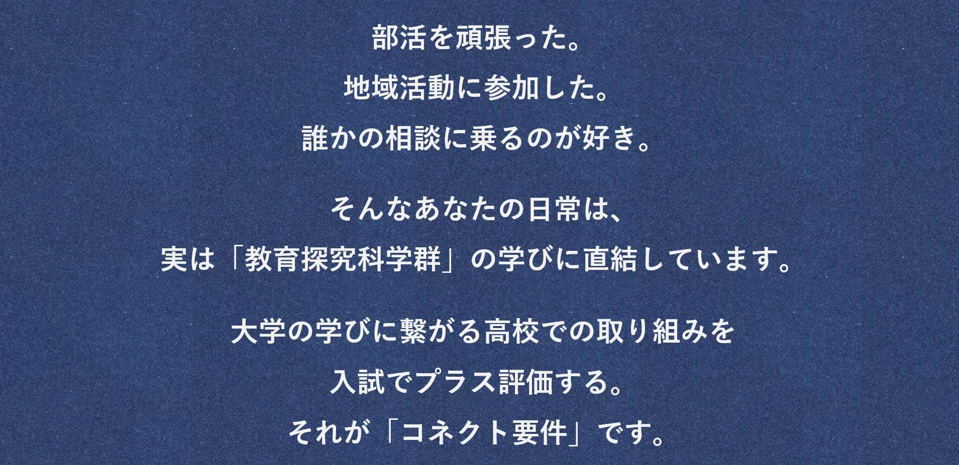 時間があれば、ぜひ「ディスカバ!」や「オープンキャンパス」の所定のプログラムに参加すればコネクト要件を満たせます。ぜひ、大学の学びに繋がる活動にチャレンジして受験時の自信に繋げてください!