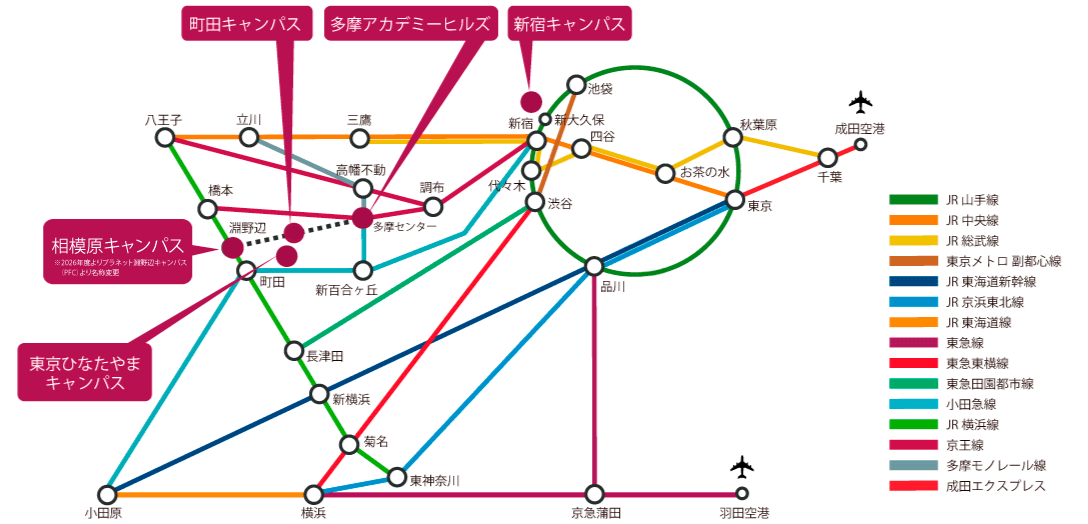 桜美林大学は首都圏を中心に複数のキャンパスを展開しています。なかでも学部生の学びの中心となるのは5つのキャンパスは、それぞれが学群・専修ごとの専門性や実践を深める各種施設や設備を誇る他、企業や行政、近隣の皆様との連携などキャンパスの外に広がる場所にもなっています。