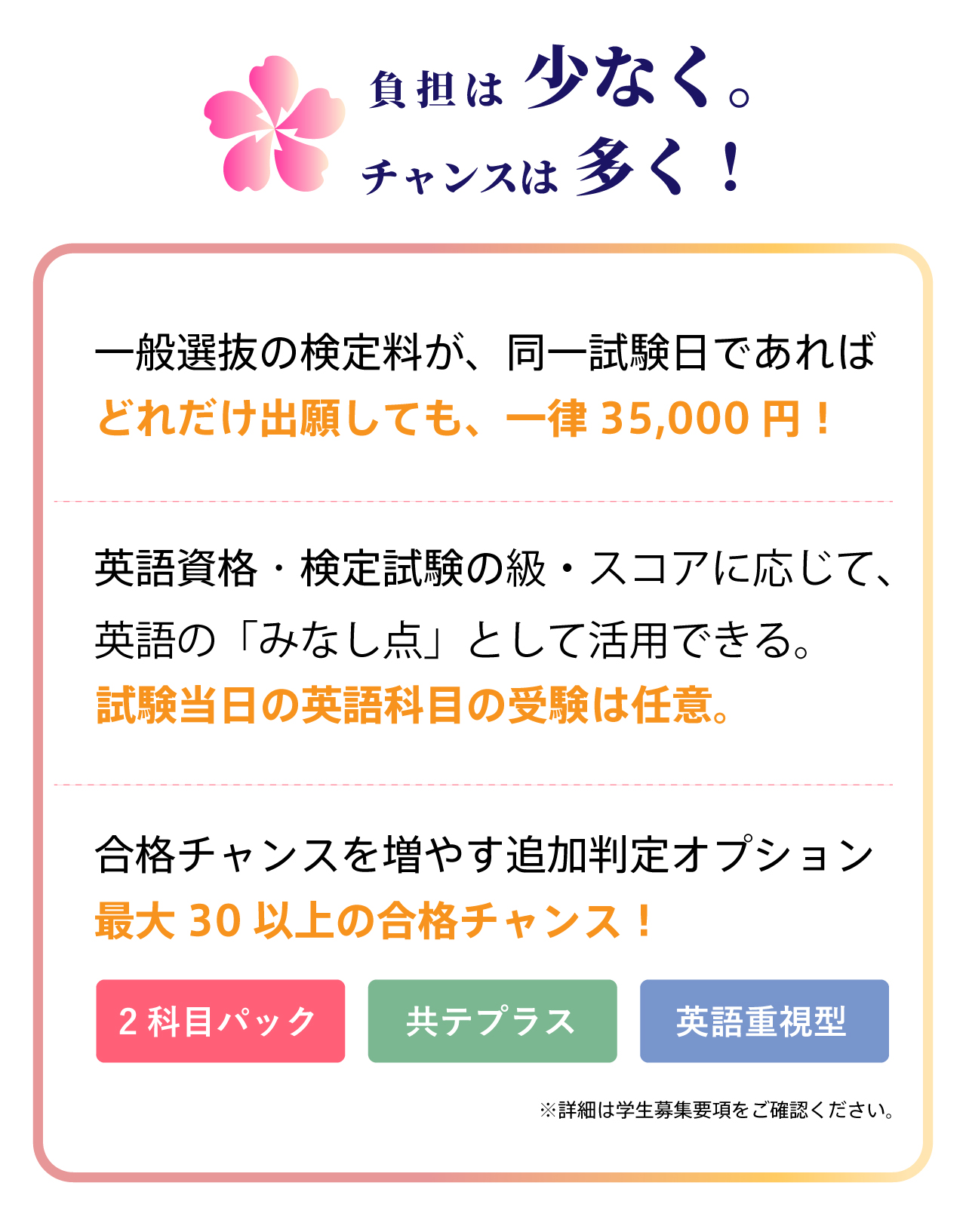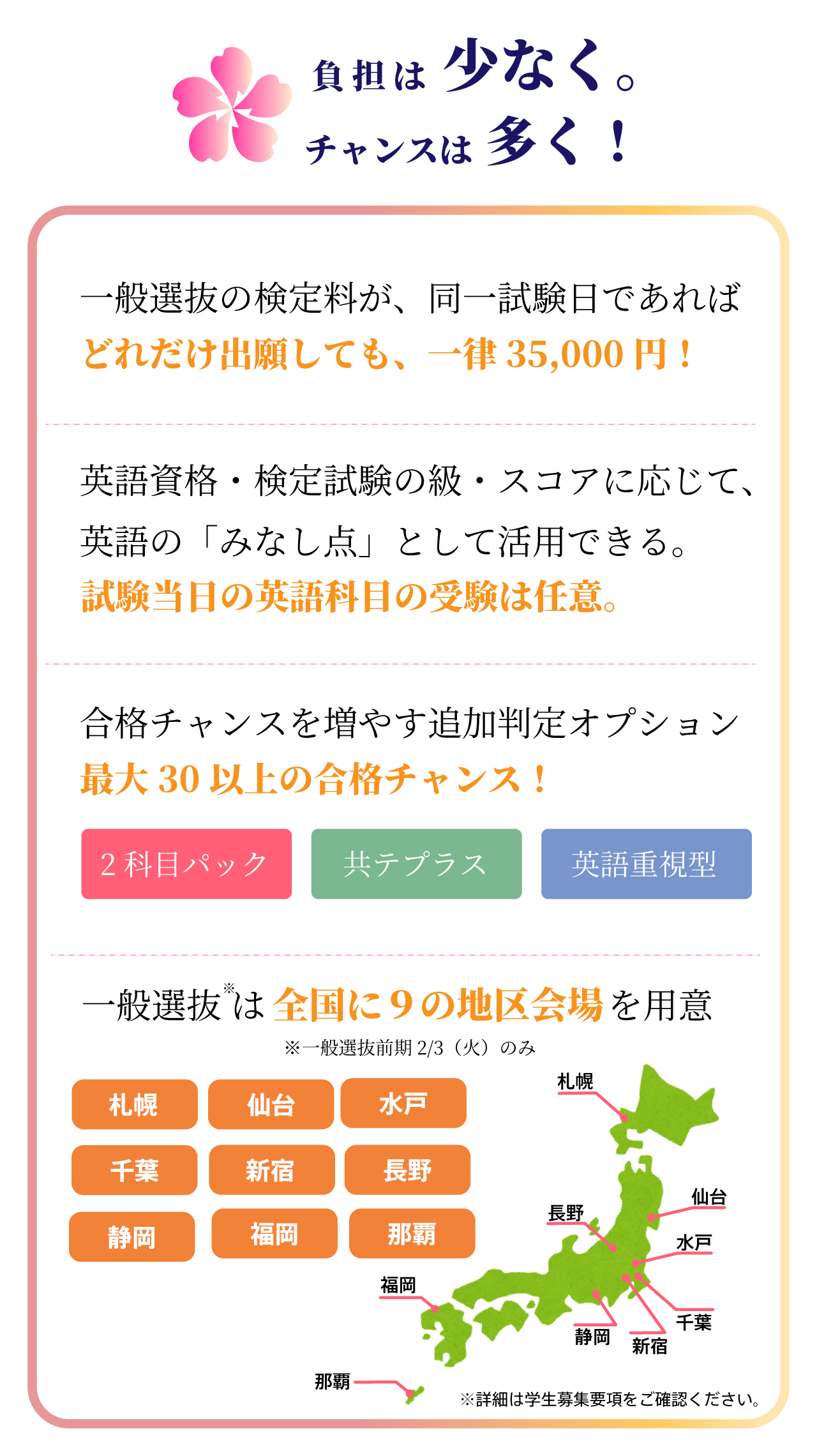 すでに受験校を決めている方も、これから併願先の私立大学を検討される方にも、ご参加いただける説明会です。桜美林大学の一般選抜入試方式の詳細や併願の仕方など、合格をつかむポイントの解説や英語試験対策講座を実施します。